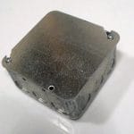 Connection Box, totally enclosed, zinc-plated steel, 4" square x 2-1/8" deep, with plain blank cover. With a minimum of 15 knockouts for 1/2" conduit located 3 on each side and on the back. Surface mounting. Per NAVSHIPS Dwg 5184170. NSN 5975-00-194-8877 (box) and 5975-00-281-0056 (cover).
