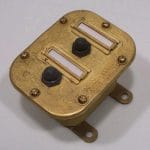 Switch assembly, pushbutton, double, 120 VAC, 15 Amps, 120 VDC 1/2 Amp, watertight, non-magnetic. Consists of 2 pushbutton switches, each having one set of normally open and normally closed contacts, mounted to the cover of a 2-1/8 x 3" (nominal) brass enclosure. Rubber boots over the pushbuttons and the gasketed cover provide watertight integrity. The normally open contacts of the switches are wired to a type 9TB4 terminal board located in the bottom of the box which has #6 studs and accommodate Type L81 terminal lugs. Plastic marker strips, white with black core, are provided on the cover to be engraved by the installing activity with the circuit names or functions. Per NavShips Drawing 9-S-73755 and Comsaco Drawing 404-2620.1. Navy SYM2620.1, Type E-18A. NSN 5930-00-096-2726. See SYM789 for a similar item with a single pushbutton and SYM2621.1 for a similar item with 3 pushbuttons.