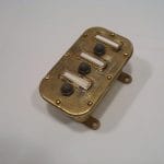 Switch assembly, pushbutton, triple, 120 VAC, 15 Amps, 120 VDC 1/2 Amp, watertight, non-magnetic. Consists of 3 pushbutton switches, each having one set of normally open and normally closed contacts, mounted to the cover of a 2-1/8 x 4-1/2" (nominal) brass enclosure. Rubber boots over the pushbuttons and the gasketed cover provide watertight integrity. The normally open contacts of the switches are wired to a type 6TB6 terminal board located in the bottom of the box which has #6 studs and accommodate Type L81 terminal lugs. Plastic marker strips, white with black core, are provided on the cover to be engraved by the installing activity with the circuit names or functions. Per NavShips Drawing 9-S-73756 and Comsaco Drawing 404-2621.1. Navy SYM2621.1, Type E-20A. NSN 5930-00-564-4683. See SYM789 for a similar item with a single pushbutton and SYM2620.1 for a similar item with 2 pushbuttons.