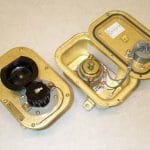 Connector receptacle, with switch, 30 amp, 450 VAC, 3 Phase with ground, watertight. Consists of a 4 pole (3 phase plus ground) receptacle mounted in the cover of a 4x7 (nominal) brass enclosure. Power to the receptacle is controlled by a 30 amp 450 VAC switch which is interlocked with the protective cap or the mating plug to prevent engaging or disengaging the plug or installing or removing the cap while the switch is in the "ON" position. This device is watertight to a depth of 3 feet with the cap or mating plug installed. Normally used to provide power to portable welding machines or submersible pumps. Per MIL-R-2726/19, Military P/N M2726/19-001. NSN 5999-00-879-1519. Mates with SYM717.1 plug per MIL-R-2726/3. Electrical connections are made directly to the terminals on the switch which have #10 screws. The ground connection to the box is a #8 screw. The receptacle assembly is a SYM758.2 and the cap assembly is a SYM1142.1.