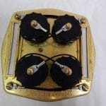 Jackbox, Sound-Powered Telephone. Quadruple, submersible to 15 feet with protective cap or mating plug installed. Provides for connection of sound-powered telephone handsets or headsets. Blank plastic engraving strips, white with black core, are provided for the installing activity to mark circuit designations. Connection is made to Type 9TB4 terminal boards mounted in the bottom of the box by use of type L81 terminal lugs. Per NavShips drawing 9000-803-74210 Rev J. Mates with SYM2922 plug per 9-S-74211. The NSN for SYM2843 is 5935-00-355-4739.