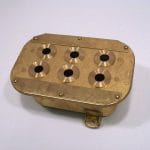 Indicator light assembly, watertight, double, 450 VAC. base mounted. Internal transformer/lampholder assemblies convert the incoming 450 volt signals to a safe 2 volts (nominal) and provides for 2 incandescent lamps per signal to indicate the presence of the signal. Failure of one lamp does not affect the other and gives the operator redundancy and time to replace the lamps if one burns out. Lenses with various colors can be installed in the cover-mounted lens holders to provide the desired color indication. A lens must be installed to achieve watertight integrity. Blank brass marker-discs are provided to be stencil-engraved by the installing activity to indicate a desired legend. Twelve lamps are supplied with each assembly. Lenses and engraved marker discs can be provided on special order. This assembly is in accordance with the NavShips Drawing 9000-S6202-73922, Type B-47B. The NSN is 6210-00-336-5874. Lenses are in accordance with MS17153, specify color when ordering. Lamps are per MS15612-3, Industry #1769. Similar to SYM2819.1 which is rated at 120 VAC. If flush mounting is desired, see SYM2819.3 (120V) or SYM2819.4 (450V).