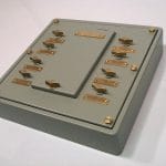 Fuse panel, 8 circuit, with switches. single phase feed, single phase loads, 125 Volts. Fuse capacity is up to 30 amps but the branch circuits are limited to 10 amps by the rating of the DPST switches (Type 1SR2A4) that are used to control the branch circuits. Uses Type F09 fuses. Feeder cable size 14 MCM maximum. Branch cable size rated at 4 MCM by the military specification. Connection to the branch circuits is at the switch terminals which have #5-40 screws. Ring type lugs are recommended. Steel enclosure. Also available in aluminum if non-magnetic panel is required or if weight is an issue. SYM603 per MIL-DTL-24646/6. Military PN M24646/6-002. NSN 6110-00-152-0268. Similar to SYM605 which has a split feeder bus and SYM616 which has a 3 phase bus.