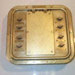 Fuse panel, 8 circuit, with switches, Watertight, 3 phase feed, single phase loads, 125 Volts. Fuse capacity is up to 30 amps but the branch circuits are limited to 10 amps by the rating of the DPST switches (Type 1SR2A4) that are used to control the branch circuits. Uses Type F09 fuses. Feeder cable size 14 MCM maximum. Branch cable size rated at 4 MCM by the military specification. Connection to the branch circuits is at the switch terminals which have #5-40 screws. Ring type lugs are recommended. Brass enclosure, size 12x13x3 per MIL-E-24142/6 with fuse door for access to fuses. SYM650.1 per MIL-DTL-24646/11. Military PN M24646/11-004. NSN 6110-00-174-1657.