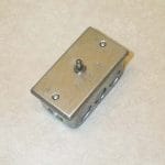 Switch assembly, toggle, double pole, double throw (on1-off-on2), 120 volts, 10 amps, Totally Enclosed, steel enclosure. Consisting of a sealed toggle switch mounted in the center of a 2x4 steel cover which is mounted to a 2x4 steel drawn box designed for surface mounting. Cable penetration is through 7/8" diameter knockouts in the sides, top and bottom of the box. Wiring interface is at #6-32 screw terminals on the switch. The use of ring-type terminals is recommended. SYM780.7 per Navsea Drawing 5184170 Method G-7-B/1. Also available as stud or flush mounting.
