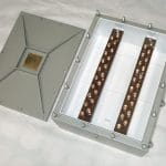 Connection box, for degaussing cables, 40 terminal, for size 14 MCM to 60 MCM cables. submersible to 15 feet (SBM-15), steel. Consists of 40 grounding service type connectors mounted on (2) GME insulators in a submersible steel enclosure with a removable cover. The enclosure is painted to resist corrosion. Each terminal connector is designed for 2 cables ranging in size from 14 MCM to 60 MCM. Cable entrance is made by the installing activity through the side walls of the box using stuffing tubes or similar devices to maintain watertight integrity. If desired, Comsaco can provide multi-cable transit devices to facilitate cable entrance to meet your specifications. SYM478.3 per MIL-C-24404/2. NSN 1075-01-235-1598. For additional corrosion resistance, this enclosure can be fabricated of Type 316 stainless steel. For weight reduction, aluminum can be used.