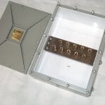 Connection box, for degaussing cables, 10 terminal, for size 75 MCM to 200 MCM cables. submersible to 15 feet (SBM-15), steel. Consists of 10 grounding service type connectors mounted on a GME insulator in a submersible steel enclosure with a removable cover. The enclosure is painted to resist corrosion. Each terminal connector is designed for 2 cables ranging in size from 75 MCM to 200 MCM. Cable entrance is made by the installing activity through the side walls of the box using stuffing tubes or similar devices to maintain watertight integrity. If desired, Comsaco can provide multi-cable transit devices to facilitate cable entrance to meet your specifications. SYM478.4 per MIL-C-24404/2. NSN 5940-01-514-1380. For additional corrosion resistance, this enclosure can be fabricated of Type 316 stainless steel. For weight reduction, aluminum can be used.