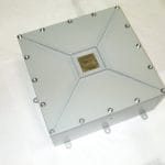 Connection box, for degaussing cables, 60 terminal, for size 14 MCM to 60 MCM cables. submersible to 15 feet (SBM-15), steel. Consists of 60 grounding service type connectors mounted on (3) GME insulators in a submersible steel enclosure with a removable cover. The enclosure is painted to resist corrosion. Each terminal connector is designed for 2 cables ranging in size from 14 MCM to 60 MCM. Cable entrance is made by the installing activity through the side walls of the box using stuffing tubes or similar devices to maintain watertight integrity. If desired, Comsaco can provide multi-cable transit devices to facilitate cable entrance to meet your specifications. SYM479.2 per MIL-C-24404/3. NSN not assigned. For additional corrosion resistance, this enclosure can be fabricated of Type 316 stainless steel. For weight reduction, aluminum can be used.