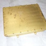 Terminal box, connection, 200 terminal, 800 wire, 600 volts, 30 amps per terminal, submersible (SBM-15), non-magnetic. Consists of (10) Type 4TB20 terminal boards mounted on brackets within a 20 x 24 x 5-3/8" deep brass enclosure assembly per MIL-E-24142/7. The removable cover is gasketed to provide submergence to a depth of 15 feet. Cable entrance is made by the installing activity through the side walls of the enclosure via stuffing tubes to maintain the enclosure effectiveness. Terminal lugs for connection to the terminal boards should have an L80 tongue shape. SYM452 per MIL-DTL-24558/15. NSN 5940-01-167-3894. See SYM454 for a similar item with more terminals.