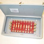Fuse Panel, Navy SYM613.1, totally enclosed, 125 volts, three phase line, single phase loads, 8 circuit, no switches. Designed for maximum feeder of 75 MCM, maximum branch cable size 14 MCM. Enclosure is non-magnetic aluminum. Can be made in steel, if desired. Specify SYM613. Also can be modified for 480 volt applications.