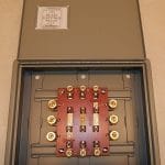 Fuse panel, Totally Enclosed, Steel, 450 Volts, 3 phase feed, 2 three phase branch circuits, for Type F15 (250 volt) or F61 (450 volt) fuses. Max feeder size 75 MCM. Max branch cable size 40 MCM. SYM543 per MIL-DTL-24646/4. Military Part Number M24646/4-001. NSN 5920-00-178-1624 or 5920-01-530-1469.