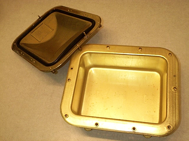 Enclosure assembly, size 10x13x5 inches deep. Brass, submersible to 15 feet. Normally furnished with domed (Type A) cover. Also available with flat (Type B) cover. Part number M24142/6-004 per MIL-E-24142/6. NSN 5975-00-296-5870. Provisions can be made for installation of a mounting plate for components inside the box and a suitable plate can be supplied to meet your requirements.