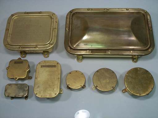 Enclosure assembly, size 10x16x5 inches deep. Brass, submersible to 15 feet. Normally furnished with domed (Type A) cover. Also available with flat (Type B) cover. Part number M24142/6-005 per MIL-E-24142/6. NSN 5975-01-376-5789. Provisions can be made for installation of a mounting plate for components inside the box and a suitable plate can be supplied to meet your requirements. The box is normally furnished 5 inches deep. It is also available with a depth of 3 inches on special order.