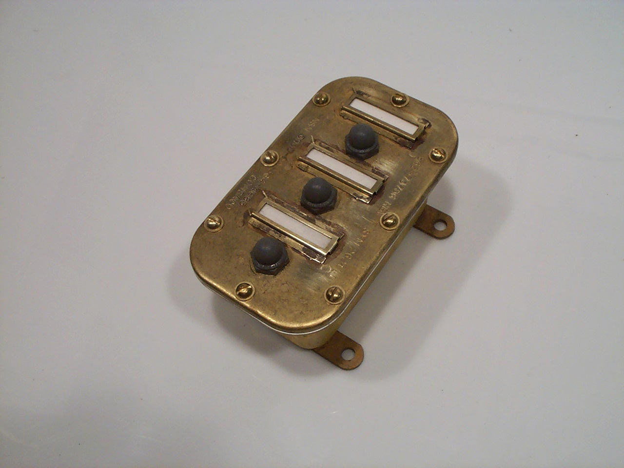 Switch assembly, pushbutton, triple, 120 VAC, 15 Amps, 120 VDC 1/2 Amp, watertight, non-magnetic. Consists of 3 pushbutton switches, each having one set of normally open and normally closed contacts, mounted to the cover of a 2-1/8 x 4-1/2" (nominal) brass enclosure. Rubber boots over the pushbuttons and the gasketed cover provide watertight integrity. The normally open contacts of the switches are wired to a type 6TB6 terminal board located in the bottom of the box which has #6 studs and accommodate Type L81 terminal lugs. Plastic marker strips, white with black core, are provided on the cover to be engraved by the installing activity with the circuit names or functions. Per NavShips Drawing 9-S-73756 and Comsaco Drawing 404-2621.1. Navy SYM2621.1, Type E-20A. NSN 5930-00-564-4683. See SYM789 for a similar item with a single pushbutton and SYM2620.1 for a similar item with 2 pushbuttons.