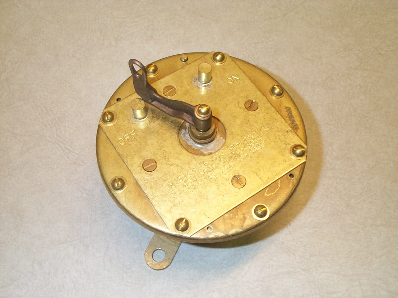 Contact maker, 6 poles, 2 positions, spring-return to "OFF", 125 VAC, 10 Amps, Submersible (15 feet). Type JRM-300 switch mounted in a 4" round brass enclosure. Lever actuated handle has no locking plate. The nameplate can be engraved or stamped with the switch function or can be left blank for marking by the installing activity. Per MIL-DTL-15743/16. NSN 5930-01-265-8011.