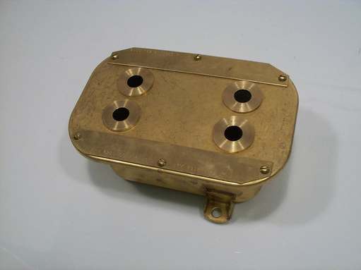 Indicator light assembly, watertight, quadruple, 120 VAC. base mounted. Internal transformer/lampholder assemblies convert the incoming 120 volt signals to a safe 2 volts (nominal) and provides for 2 incandescent lamps per signal to indicate the presence of the signal. Failure of one lamp does not affect the other and gives the operator redundancy and time to replace the lamps if one burns out. Lenses with various colors can be installed in the cover-mounted lens holders to provide the desired color indication. A lens must be installed to achieve watertight integrity. Blank brass marker-discs are provided to be stencil-engraved by the installing activity to indicate a desired legend. Eight lamps are supplied with each assembly. Lenses and engraved marker discs can be provided on special order. This assembly is in accordance with the NavShips Drawing 9000-S6202-73921, Type B-45A. The NSN is 6210-00-336-5871. Lenses are in accordance with MS17153, specify color when ordering. Lamps are per MS15612-3, Industry #1769. Similar to SYM2818.2 which is rated at 450 VAC. If flush mounting is desired, see SYM2818.3 (120V) or SYM2818.4 (450V).