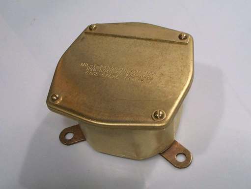 Connection box, 4 terminal, 12 wires, 150 volts, 15 amps, brass. Submersible to 15 feet. One (1) type 13TB4 terminal board in 4" enclosure. P/N M24558/18-002 per MIL-T-24558/18. NSN 5940-00-231-0831.
