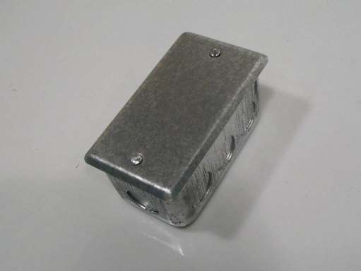 Connection Box, zinc-plated steel, totally enclosed, 2 x 4 x 2-1/8" deep with plain flat cover, with eleven (11) knockouts for 1/2" conduit located 3 on each side, 1 on each end and 3 on the back. Surface mounting. Per NAVSHIPS Dwg 5184170. NSN 5975-00-284-5827 (box) and 5975-00-280-7921 (cover).