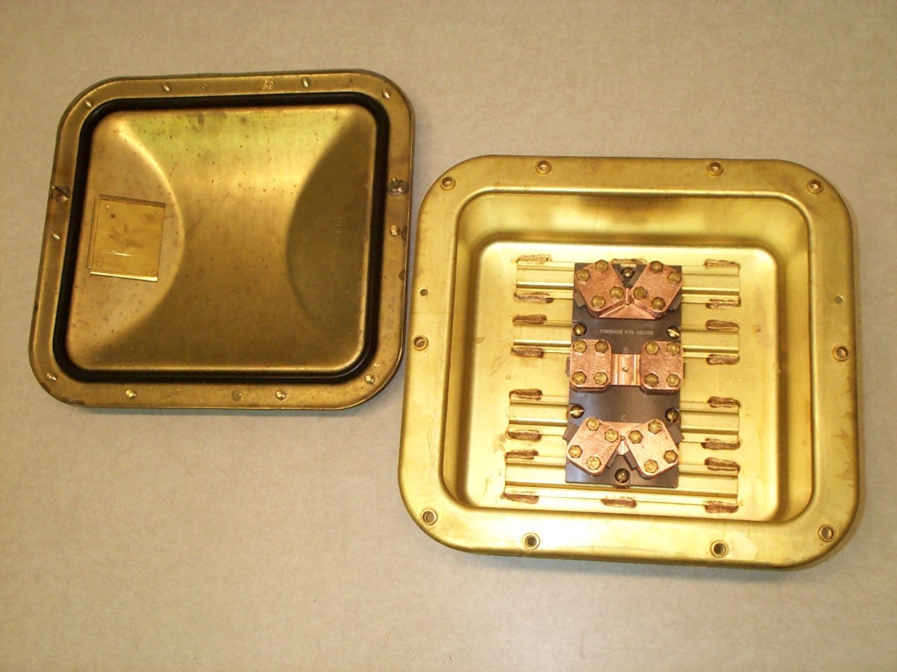 Terminal/connection box, 500 volts, 3 phase, 2 circuit, for two (2) 3 conductor cables up to 250 MCM, submersible to 15 feet, non-magnetic. Consists of 3 bus bar weldments mounted on a laminated plastic (GME) insulator secured to the bottom of a 12 x 13 enclosure per MIL-E-24142/6. The cables are clamped between a fixed and moveable cap which have grooves cut in them to keep the cable in place. The groove is sized for a maximum cable size of 250 MCM. Larger cable sizes can be accommodated by increasing the size of the groove which also changes the SYMnumber. SYM418.2 accommodates cables up to 300 MCM. SYM418.3 accommodates up to 400 MCM. Part number M24558/25-418.1 per MIL-T-24558/25. NSN 5940-00-216-7409 applies to the SYM418.1 which is the only NSN assigned to this group.