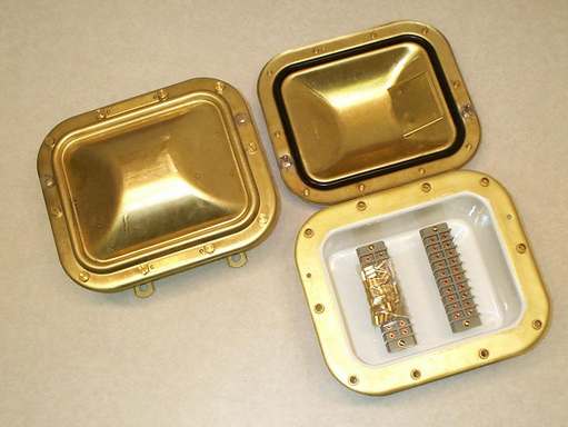 Terminal box, 40 terminal, 160 wires, 600 volts, 40 amps per terminal, submersible to 15 feet. 2 type 4TB20 terminal boards mounted in an 8 x 10 x 5" deep brass enclosure. P/N M24558/6-433.1 per MIL-T-24558/6. NSN 5940-00-215-5963