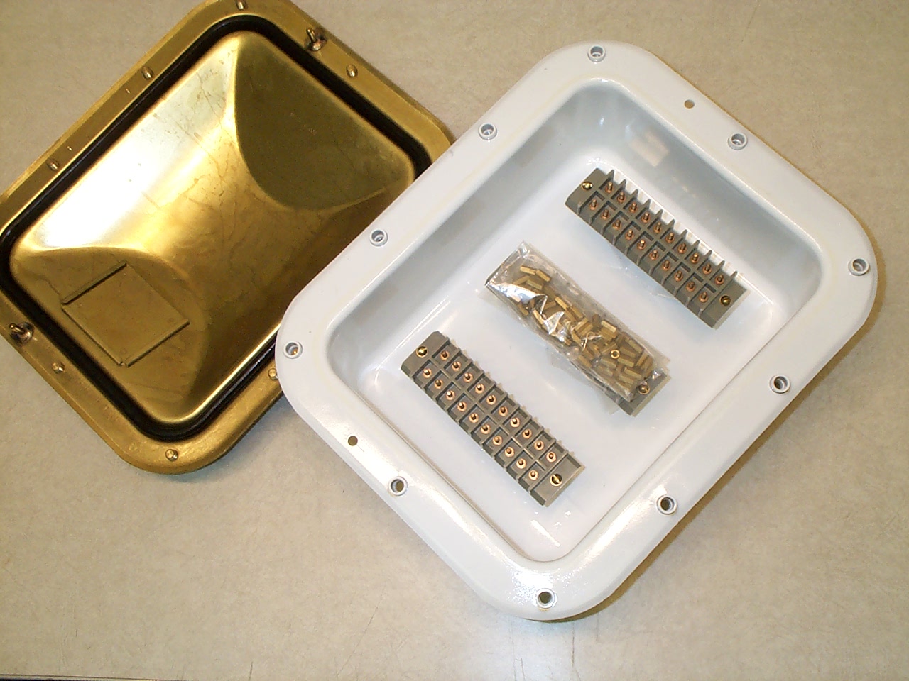 Terminal box, 60 terminal, 240 wires, 600 volts, 40 amps max per terminal, submersible to 15 feet. 3 Type 4TB20 terminal boards mounted in a 10x13x5" deep brass enclosure. Military Part Number M24558/8-446 per MIL-DTL-24558/8. NSNs 5940-00-215-5967 and 5940-01-246-0848 are assigned. Normally supplied with domed cover.