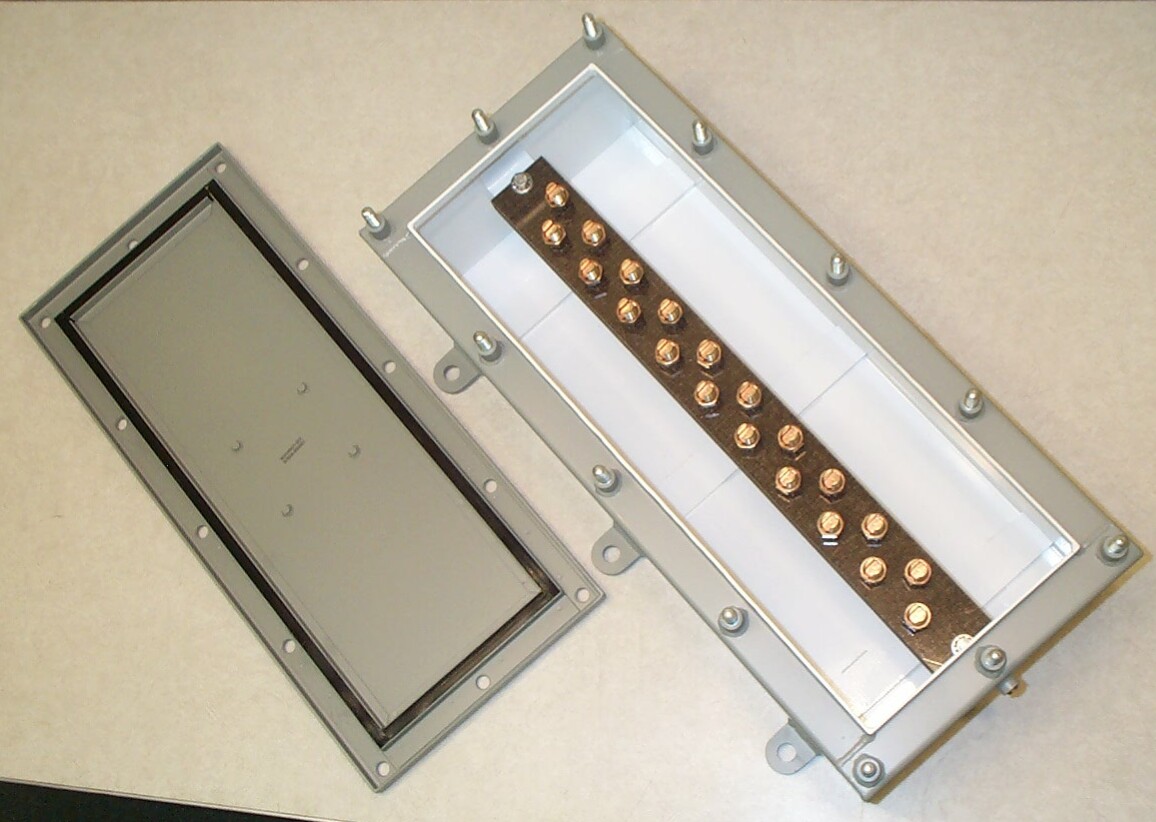 Connection box, for degaussing cables, 20 terminal, for size 14 MCM to 60 MCM cables. submersible to 15 feet (SBM-15), steel. Consists of 20 grounding service type connectors mounted on a GME insulator in a submersible steel enclosure with a removable cover. The enclosure is painted to resist corrosion. Each terminal connector is designed for 2 cables ranging in size from 14 MCM to 60 MCM. Cable entrance is made by the installing activity through the side walls of the box using stuffing tubes or similar devices to maintain watertight integrity. If desired, Comsaco can provide multi-cable transit devices to facilitate cable entrance to meet your specifications. SYM477.2 per MIL-C-24404/1. NSN 5940-01-379-2271. For additional corrosion resistance, this enclosure can be fabricated of Type 316 stainless steel. For weight reduction, aluminum can be used.
