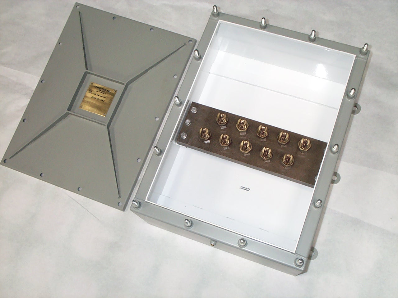 Connection box, for degaussing cables, 10 terminal, for size 75 MCM to 200 MCM cables. submersible to 15 feet (SBM-15), steel. Consists of 10 grounding service type connectors mounted on a GME insulator in a submersible steel enclosure with a removable cover. The enclosure is painted to resist corrosion. Each terminal connector is designed for 2 cables ranging in size from 75 MCM to 200 MCM. Cable entrance is made by the installing activity through the side walls of the box using stuffing tubes or similar devices to maintain watertight integrity. If desired, Comsaco can provide multi-cable transit devices to facilitate cable entrance to meet your specifications. SYM478.4 per MIL-C-24404/2. NSN 5940-01-514-1380. For additional corrosion resistance, this enclosure can be fabricated of Type 316 stainless steel. For weight reduction, aluminum can be used.
