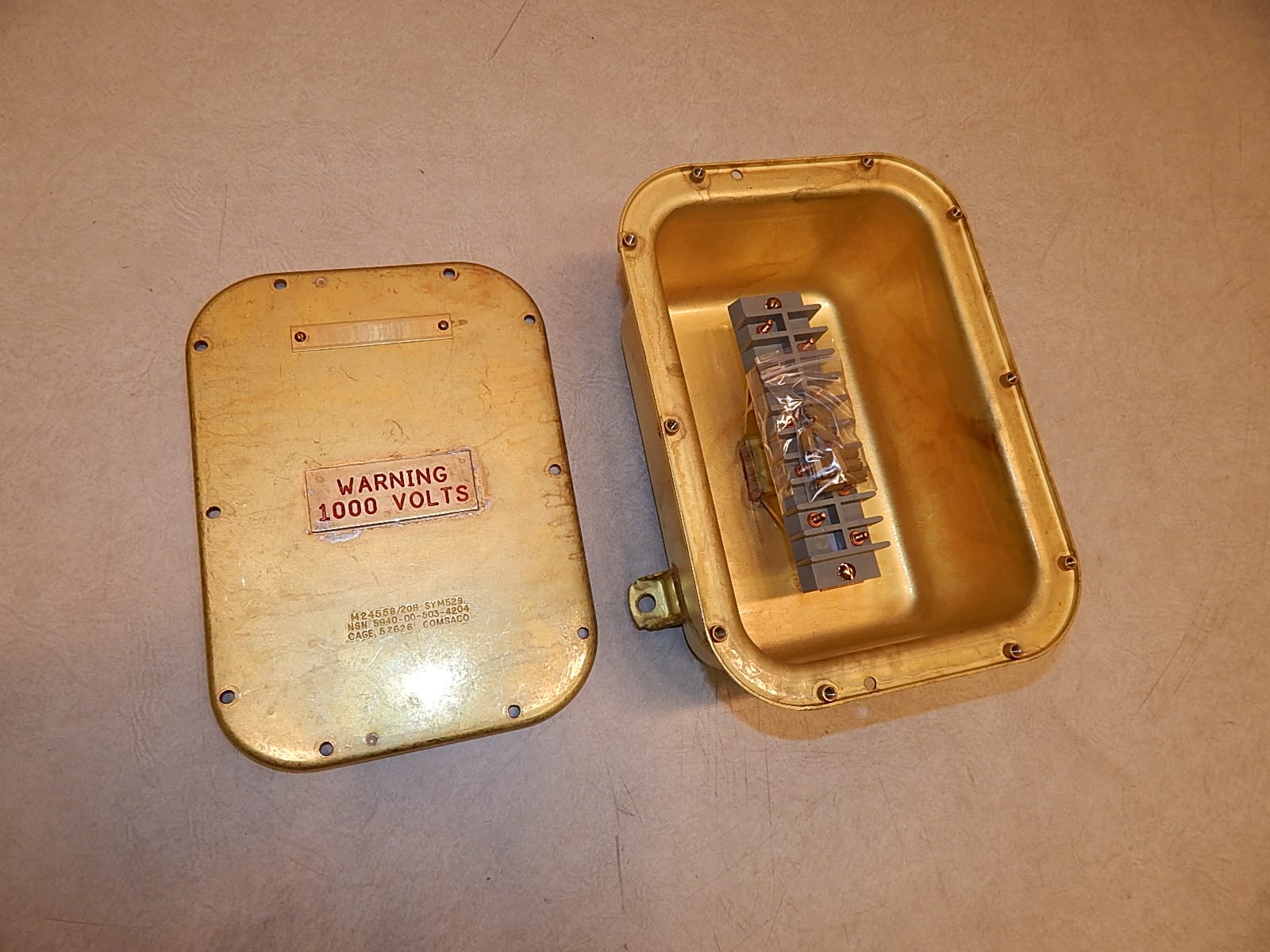 Terminal box, 10 terminal, 20 wires max, 1,000 volts, 40 amps max per terminal, submersible to 15 feet. Type 16TB10 terminal board mounted in a 6x9x4-1/2" deep brass enclosure. Part number M24558/20-529 per MIL-T-24558/20. NSN 5940-00-503-4204. Previously covered by NAVSHIPS drawing 815-1197015.