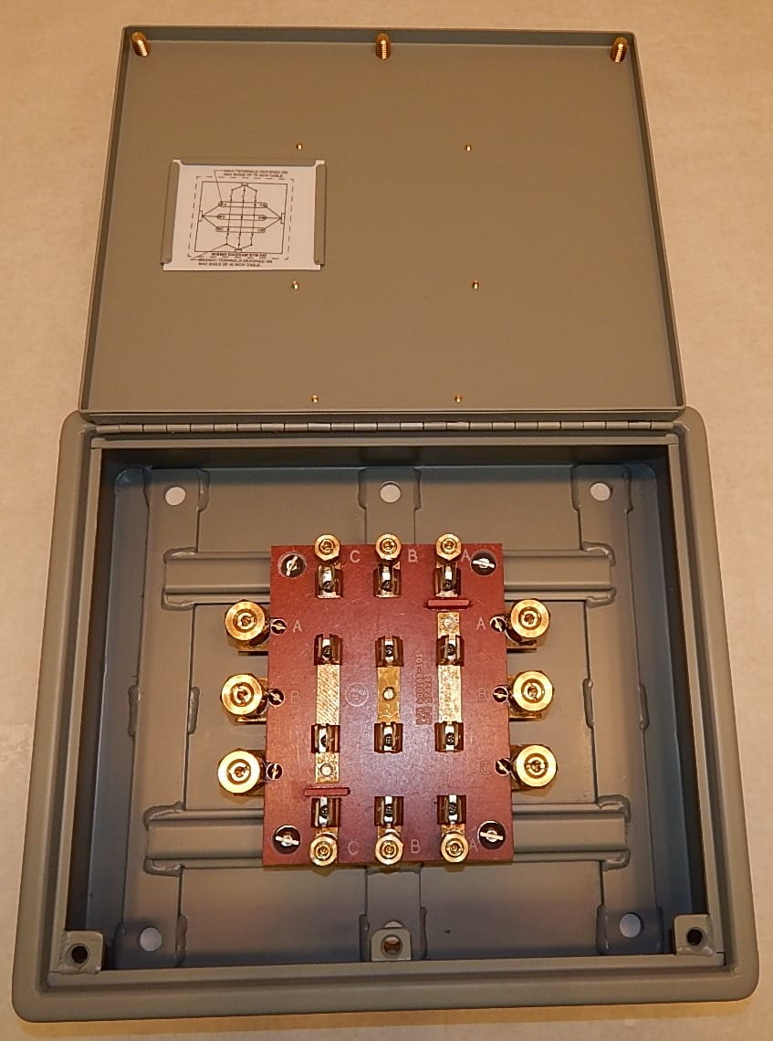 Fuse panel, Totally Enclosed, Steel, 450 Volts, 3 phase feed, 2 three phase branch circuits, for Type F15 (250 volt) or F61 (450 volt) fuses. Max feeder size 75 MCM. Max branch cable size 40 MCM. SYM543 per MIL-DTL-24646/4. Military Part Number M24646/4-001. NSN 5920-00-178-1624 or 5920-01-530-1469.