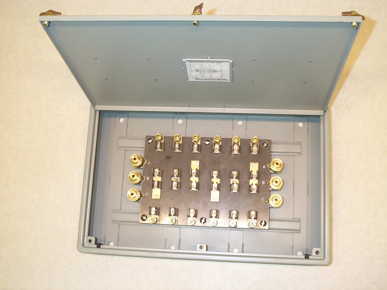 Fuse panel, 4 circuit, for 31 - 60 amp fuses. Totally Enclosed, Steel, 450 Volts, 3 phase feed, 3 phase branch circuits, for Type F16 or F62 fuses. Max feeder size 200 MCM. Max branch cable size 40 MCM. SYM547 per MIL-DTL-24646/4. Military Part Number M24646/4-005. NSN 5920-00-178-1614.