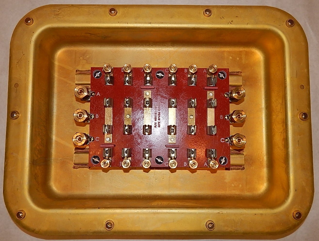 Fuse panel, 4 circuit, no switches, 3 phase feed, 6 single and 4 phase loads. Submersible (SBM-15), 250 volts AC, 0-30 amp Type F09 fuses. For up to 75 MCM feeder, 40 MCM load cables connecting to compression type lugs per 9-S-73246 and 73055, respectively. Brass enclosure size 12 x 17 x 3 per MIL-E-24142/6. SYM561.1 per MIL-DTL-24646/10. Military P/N M24646/10-002. NSN 5920-00-028-3963. Weight 35.5 lbs.