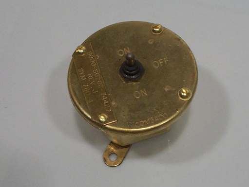 Switch assembly, toggle, DPDT, 10 Amp AC, 5 Amp DC, 125 V, non-magnetic, watertight. Consists of a double pole double throw (on-off-on) toggle switch mounted to the cover of a nominal 2-1/2" round brass enclosure. A rubber boot over the toggle provides watertight integrity along with the gasketed cover of the enclosure. Electrical connections are made directly to the switch contacts which are provided with #6-32 screws. This item is manufactured in accordance with NavShips Drawing 9-S-74427 and Comsaco Drawing 404-780.4. NSN 5930-00-522-5646. If single throw switching (on-off) is required, see SYM780.2.