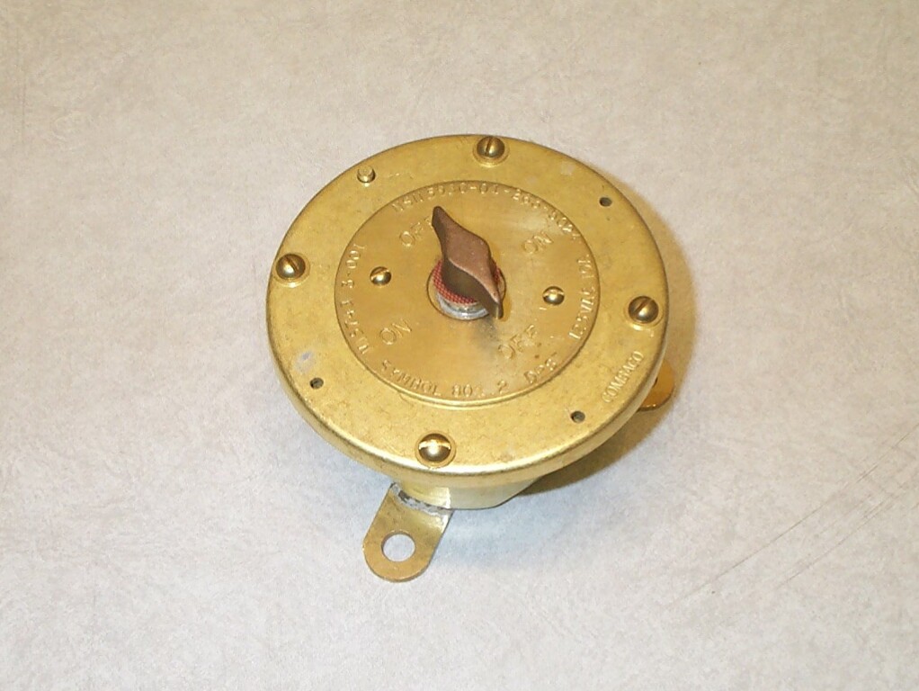 Switch, rotary enclosed, 10 amp, 125 VAC, double pole, single throw (DPST), submersible to 15 feet, non-magnetic. surface mounting. Consists of a Type 1SR2A4 rotary switch per MIL-S-15291/3 mounted in a 3" round brass enclosure per MIL-E-24142/5 that is actuated by a sealed shaft penetrating the cover. The assembly mounts with (3) 3/8" bolts, 120 degrees apart on a 4-1/2" bolt circle. Switch action is ON-OFF-ON-OFF. SYM801.2 per MIL-DTL-15743/3, part number M15743/3-001. NSN 5930-00-617-2314 and 5930-01-263-5024. Similar to SYM801.1 which is recess-mounted.
