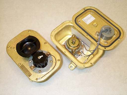 Connector receptacle, with switch, 30 amp, 450 VAC, 3 Phase with ground, watertight. Consists of a 4 pole (3 phase plus ground) receptacle mounted in the cover of a 4x7 (nominal) brass enclosure. Power to the receptacle is controlled by a 30 amp 450 VAC switch which is interlocked with the protective cap or the mating plug to prevent engaging or disengaging the plug or installing or removing the cap while the switch is in the "ON" position. This device is watertight to a depth of 3 feet with the cap or mating plug installed. Normally used to provide power to portable welding machines or submersible pumps. Per MIL-R-2726/19, Military P/N M2726/19-001. NSN 5999-00-879-1519. Mates with SYM717.1 plug per MIL-R-2726/3. Electrical connections are made directly to the terminals on the switch which have #10 screws. The ground connection to the box is a #8 screw. The receptacle assembly is a SYM758.2 and the cap assembly is a SYM1142.1.
